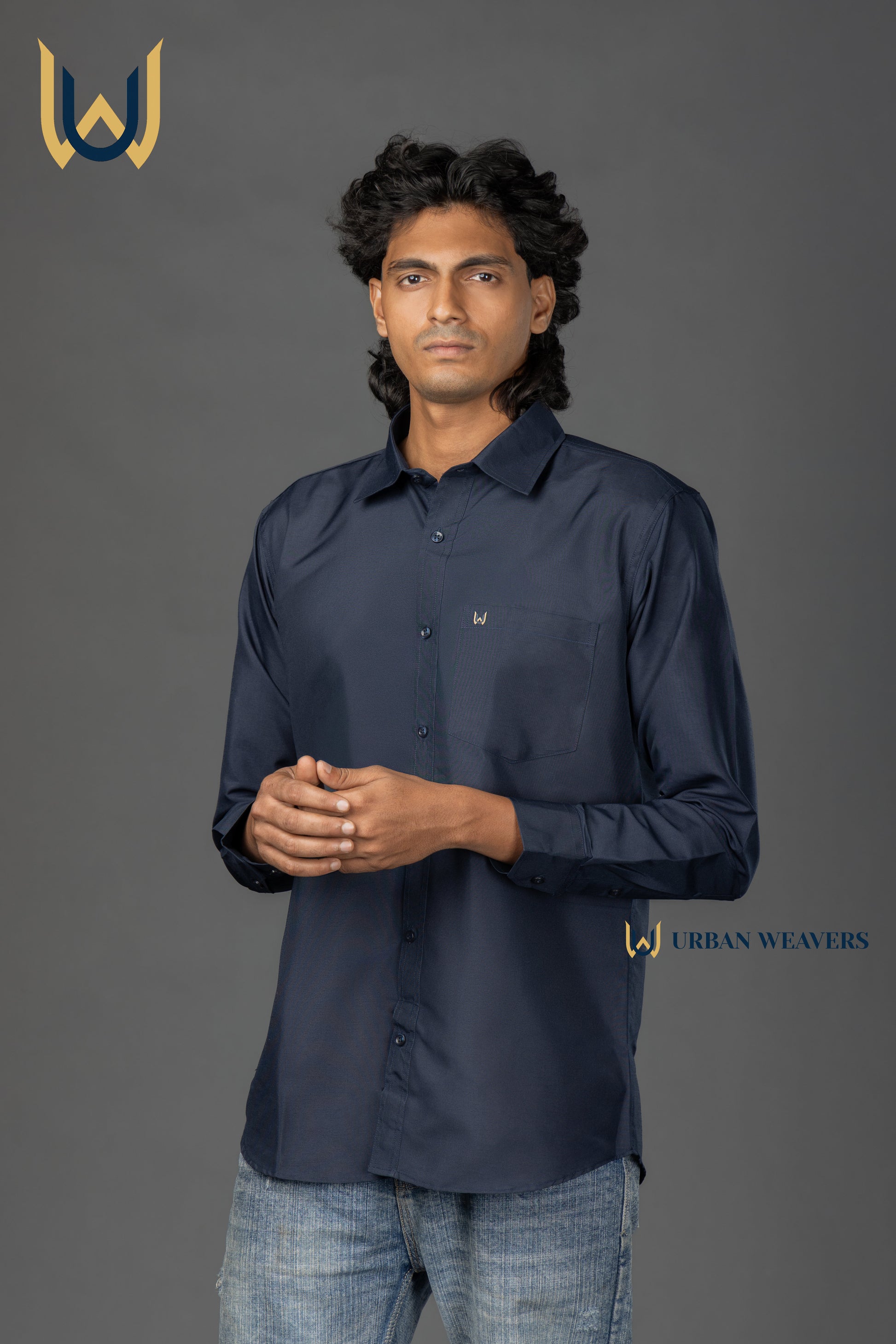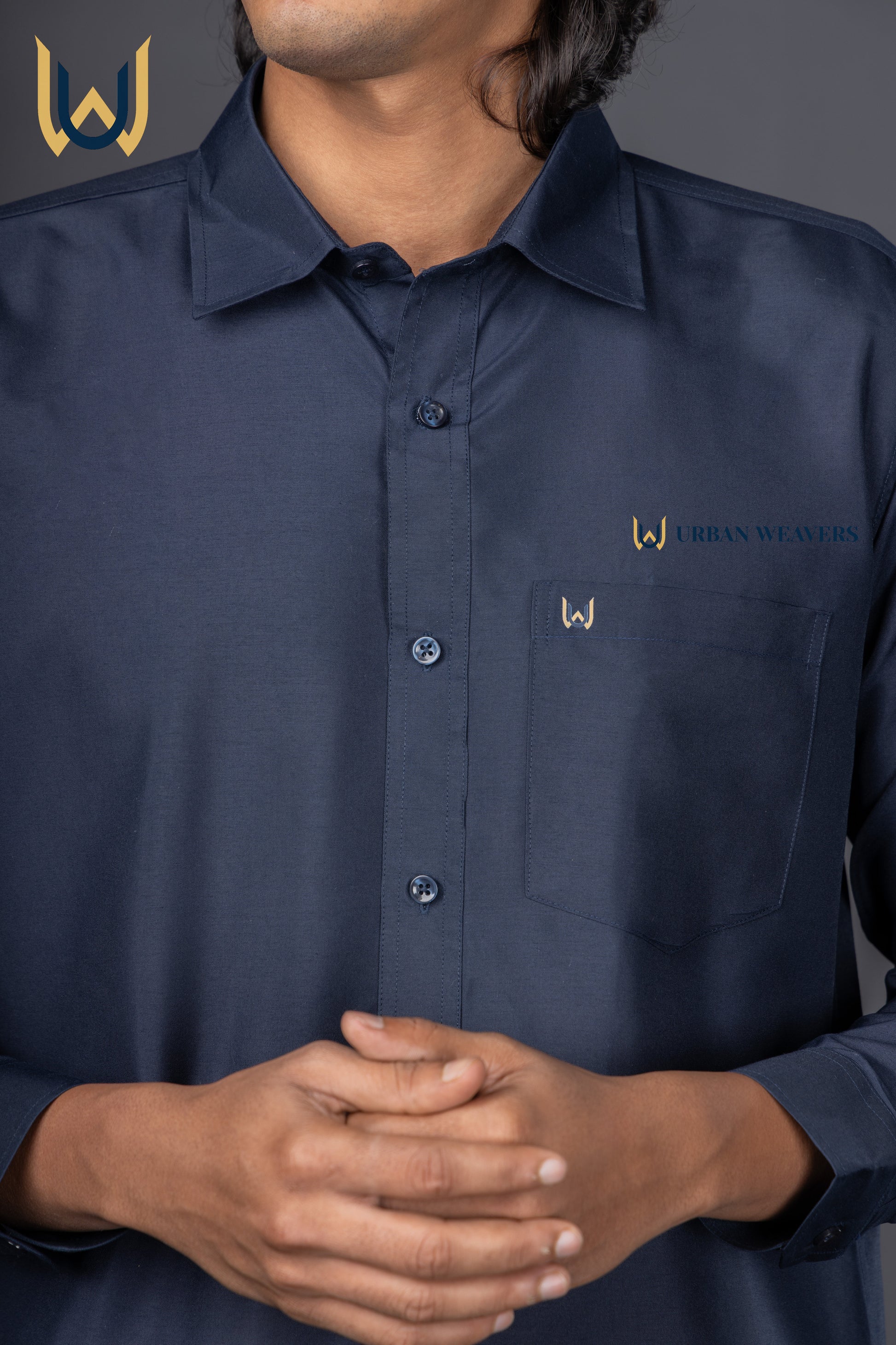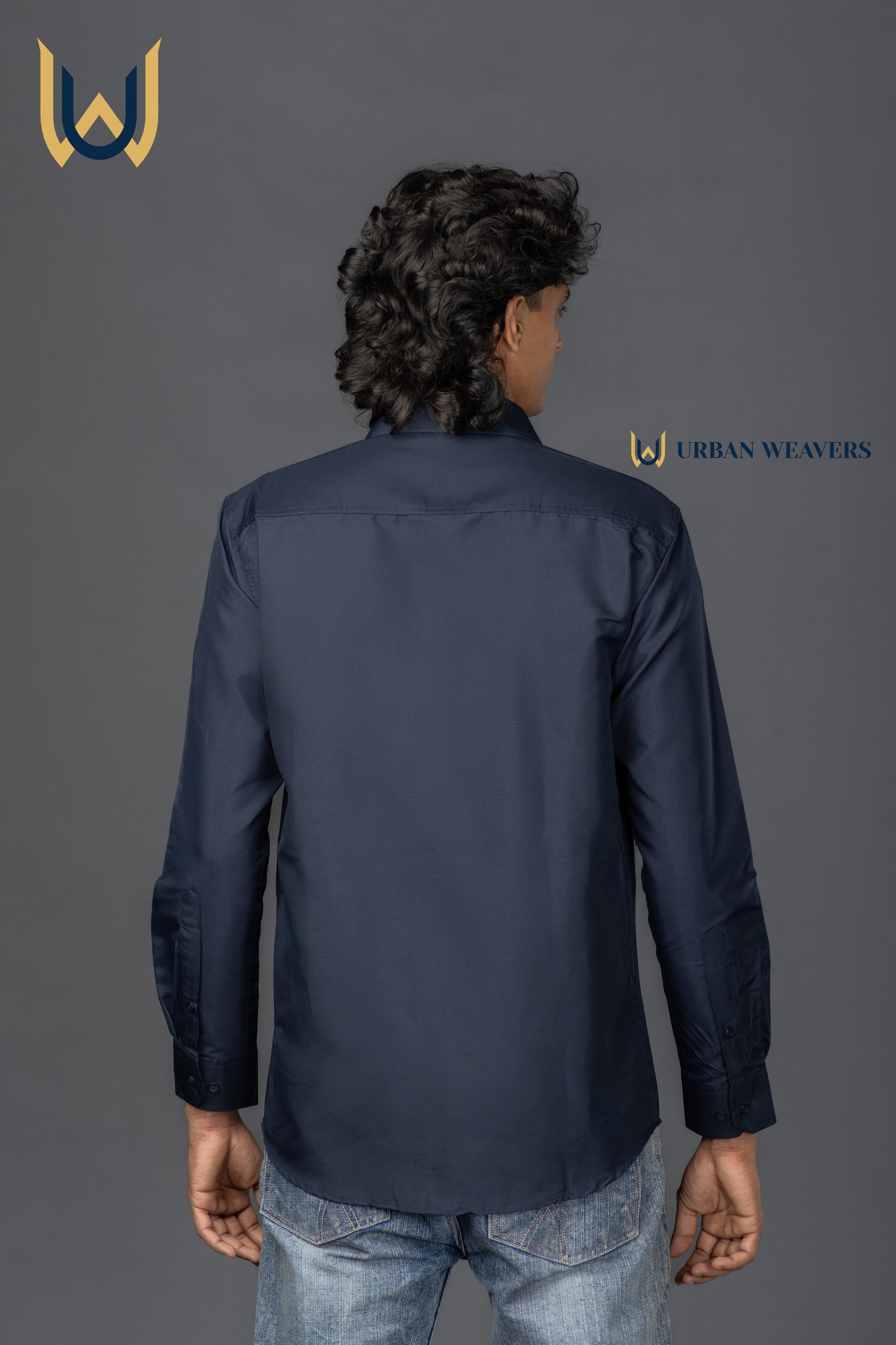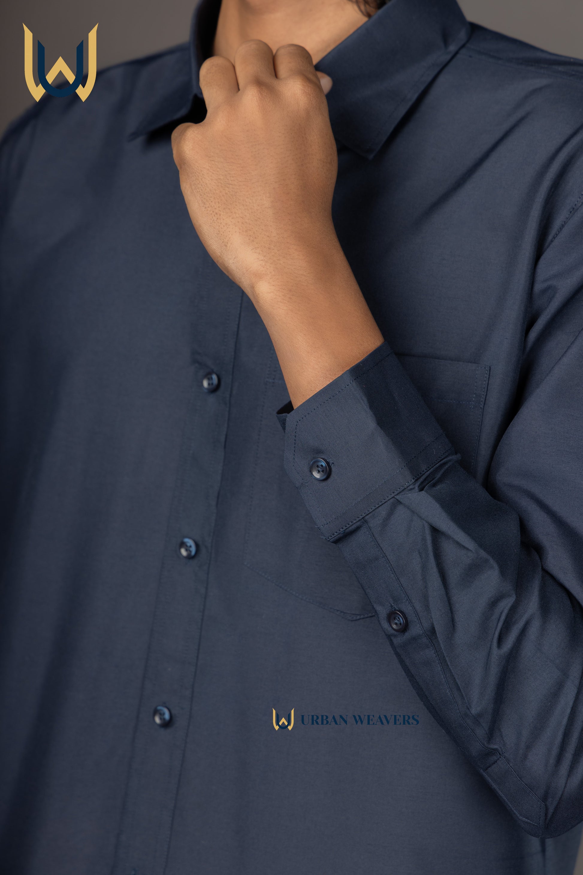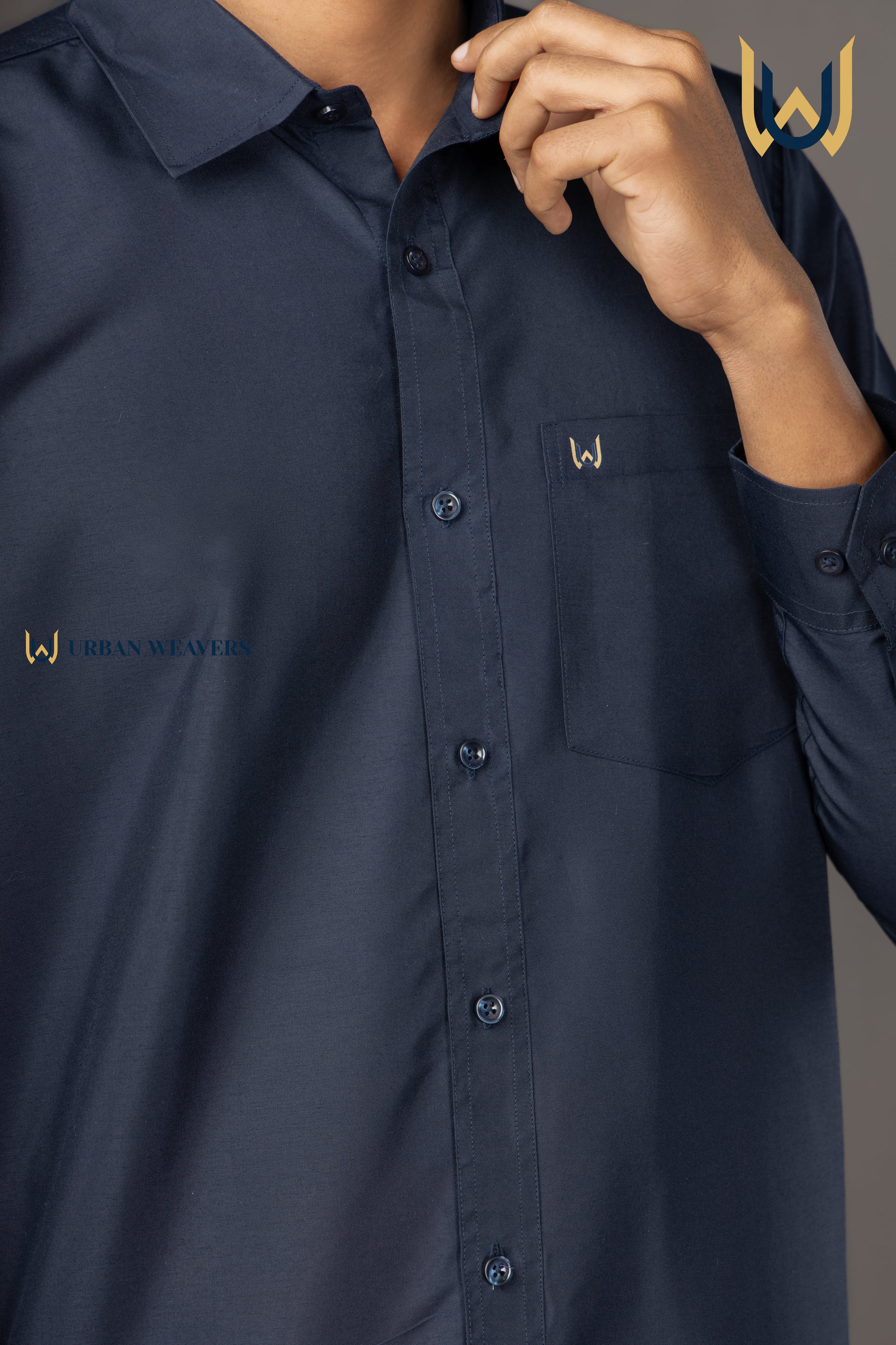 Full-sleeve navy shirt featuring a deep solid tone, offering a sharp and confident look. Designed with a straight cut and clean silhouette, it includes minimal detailing for a modern, versatile appeal.