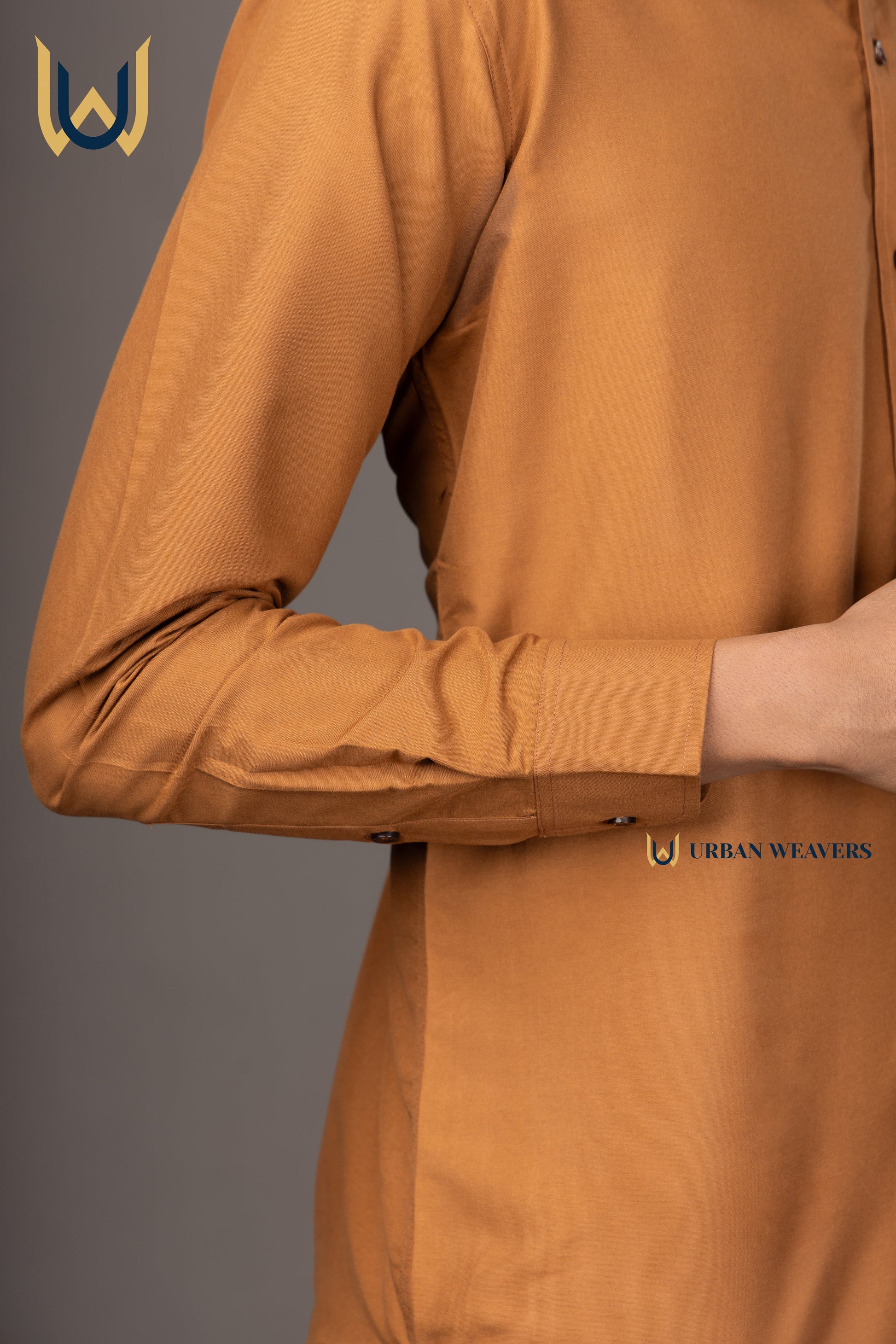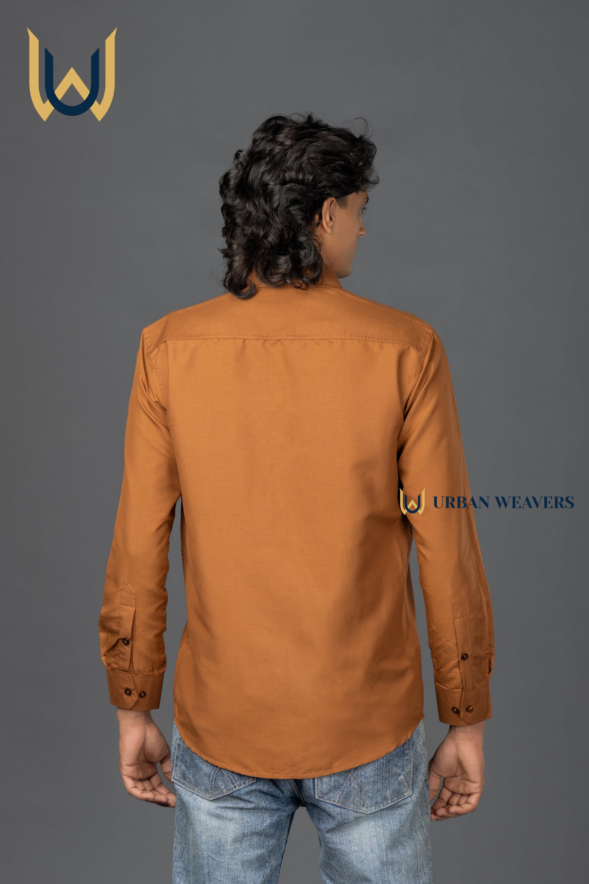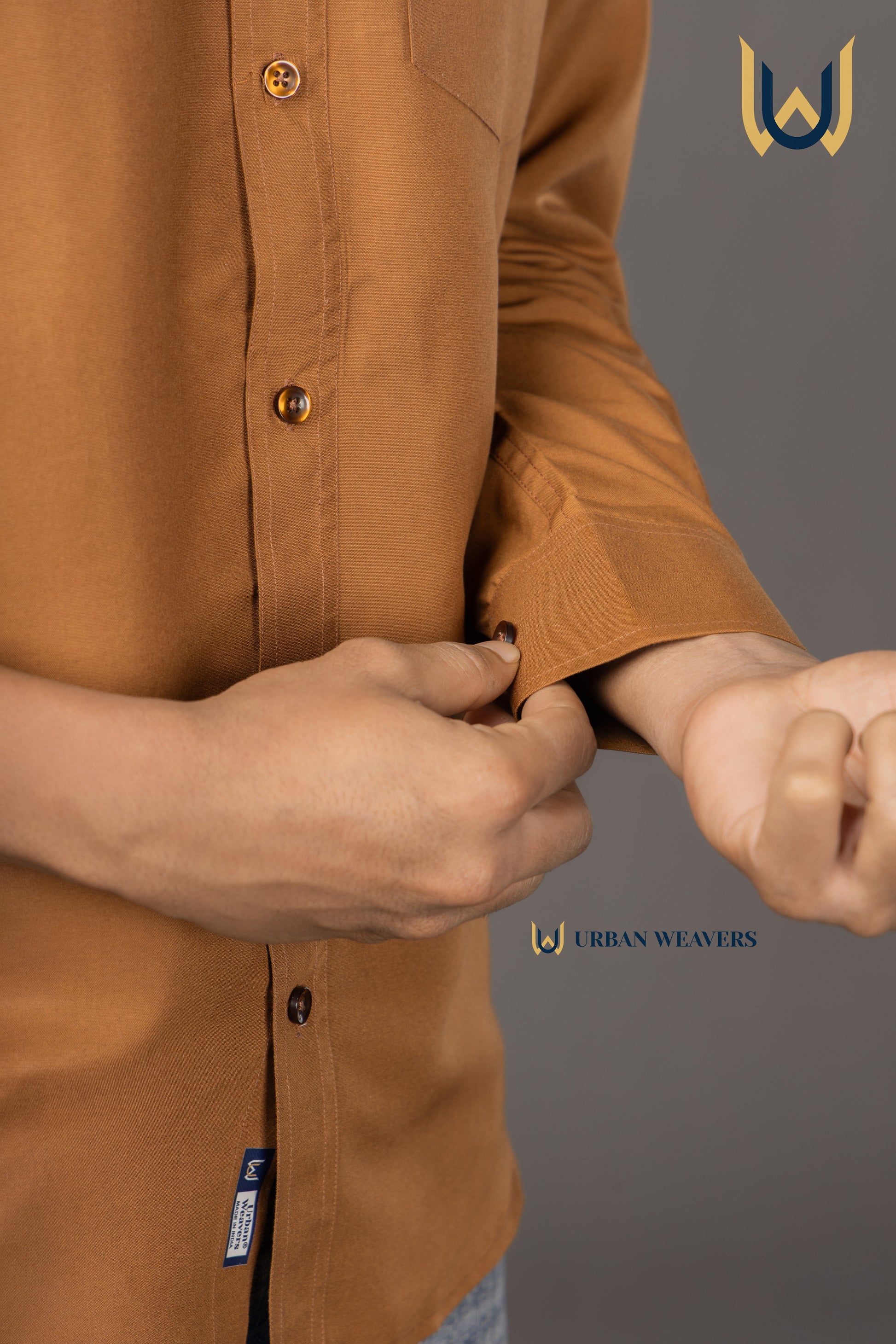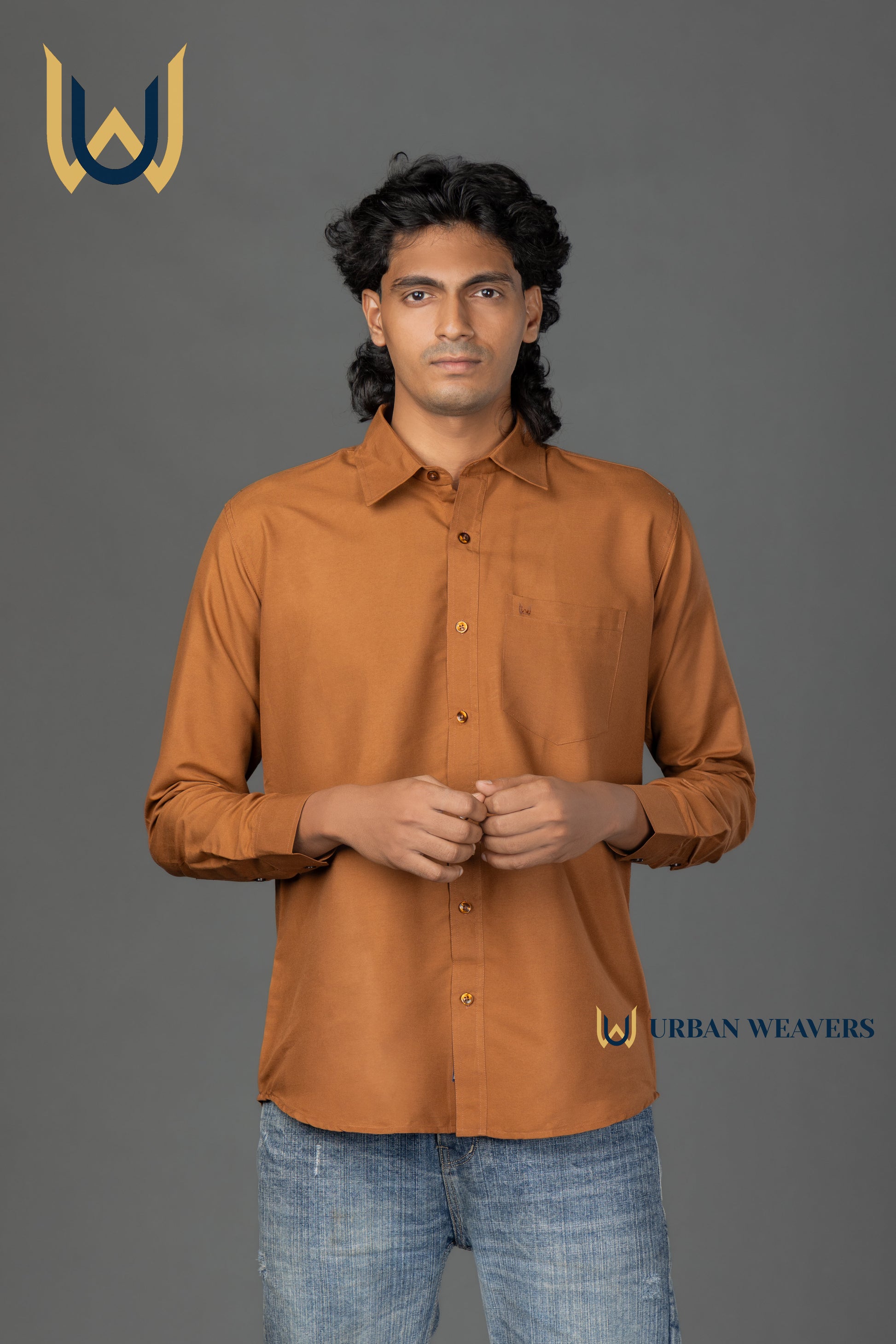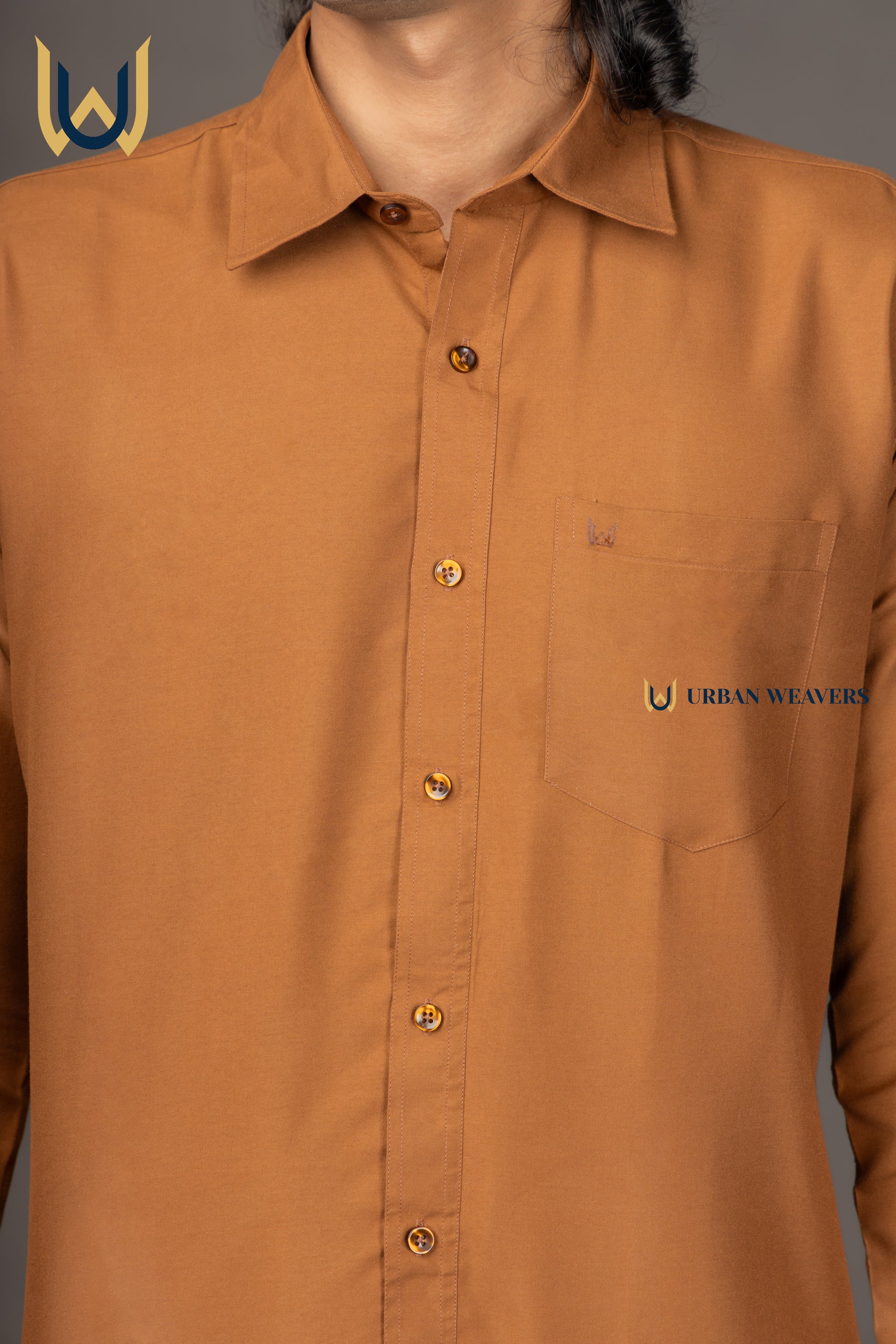 Full-sleeve cinnamon shirt featuring a rich solid tone, offering a warm and confident look. Designed with a straight cut and clean silhouette, it includes minimal detailing for a modern, versatile appeal.