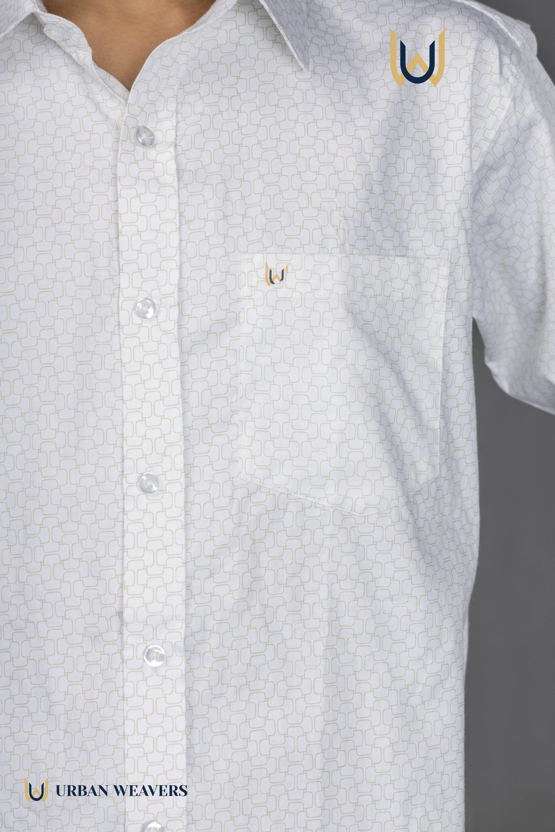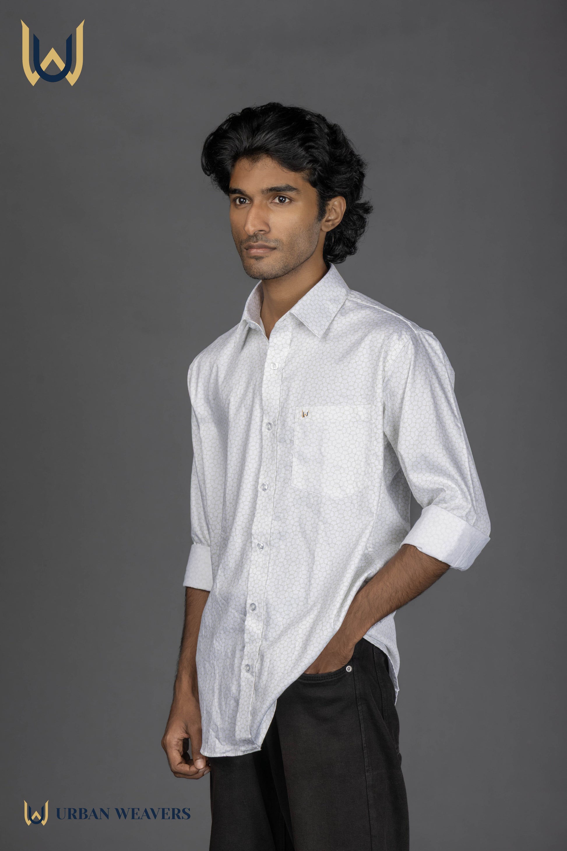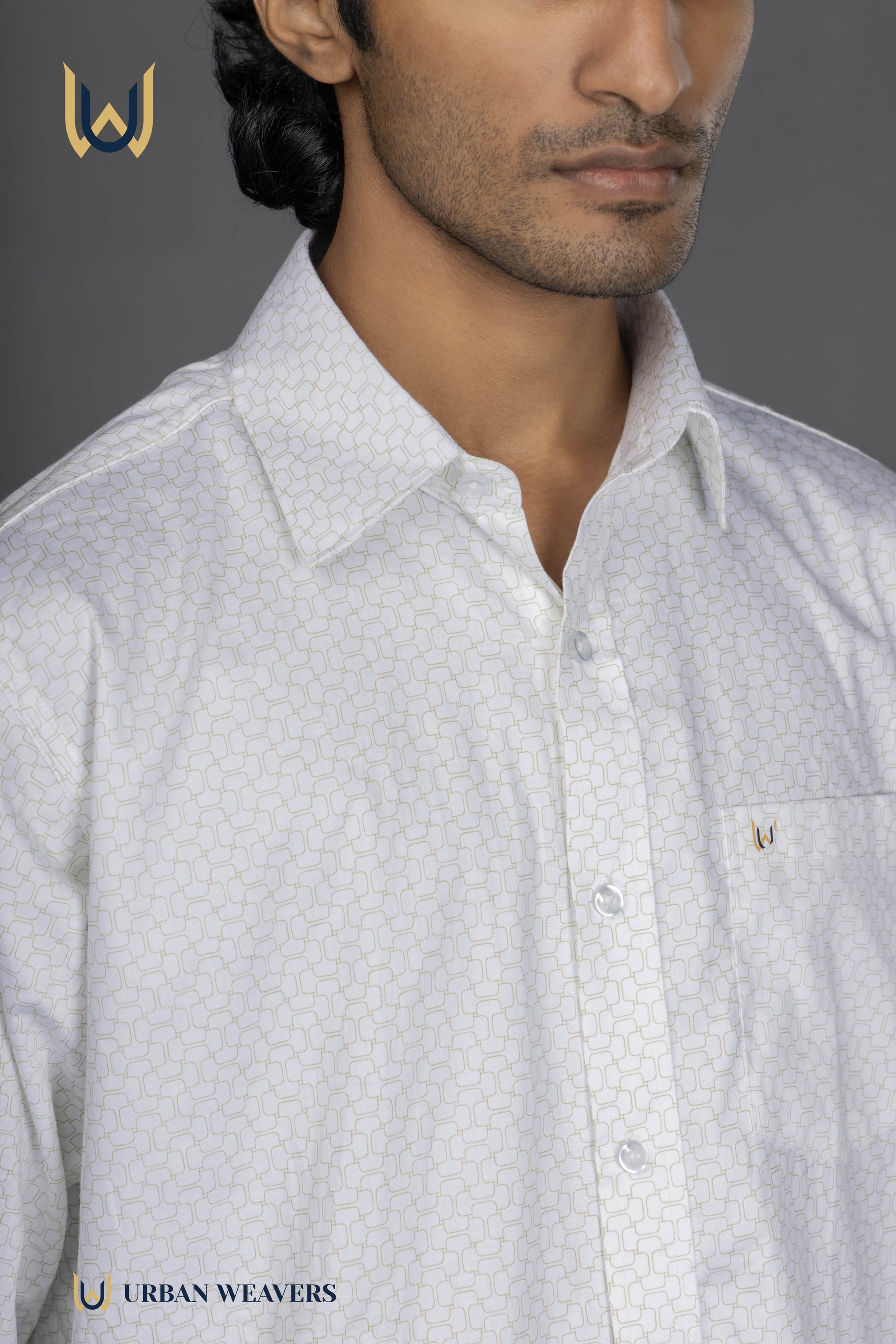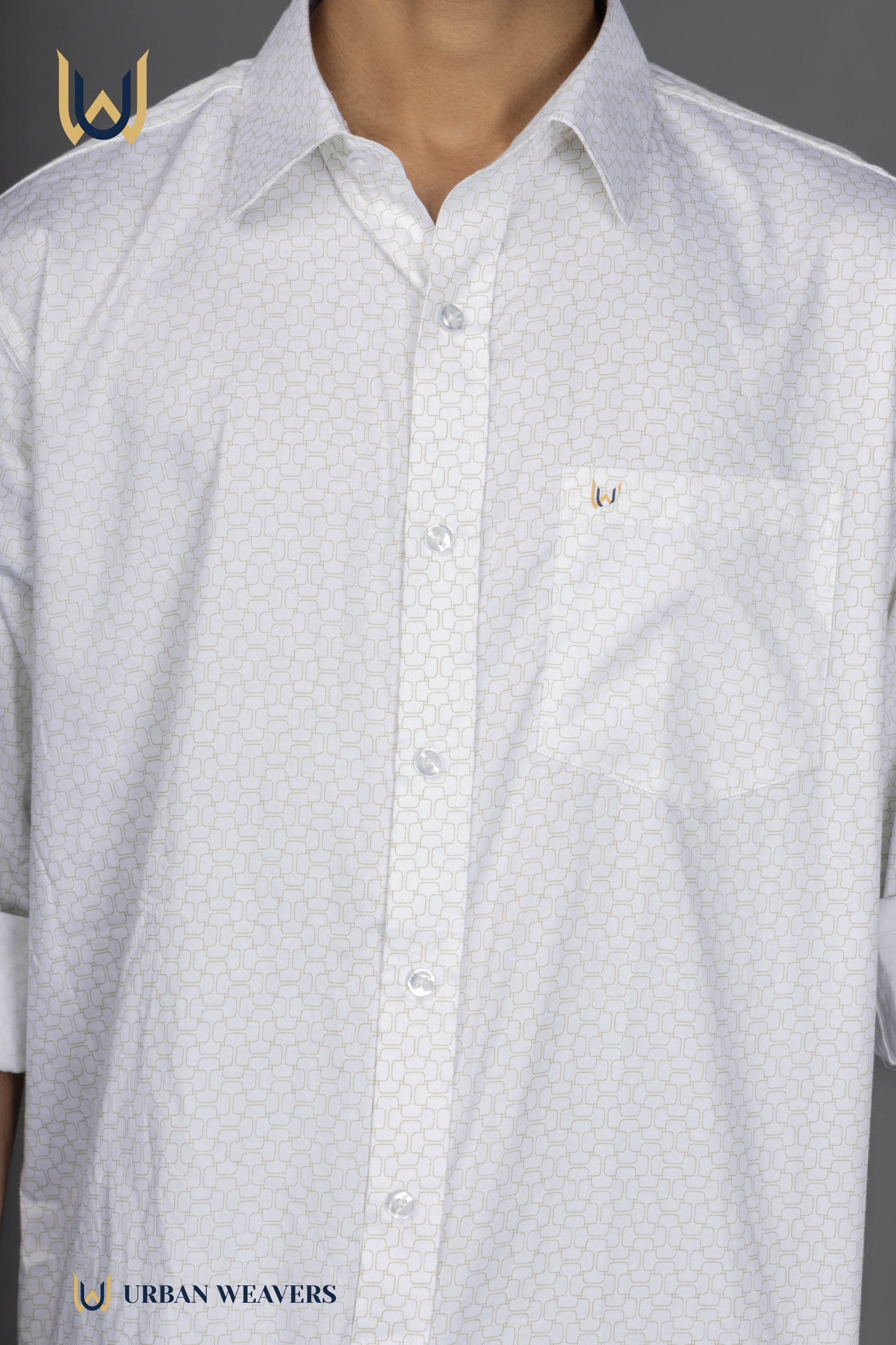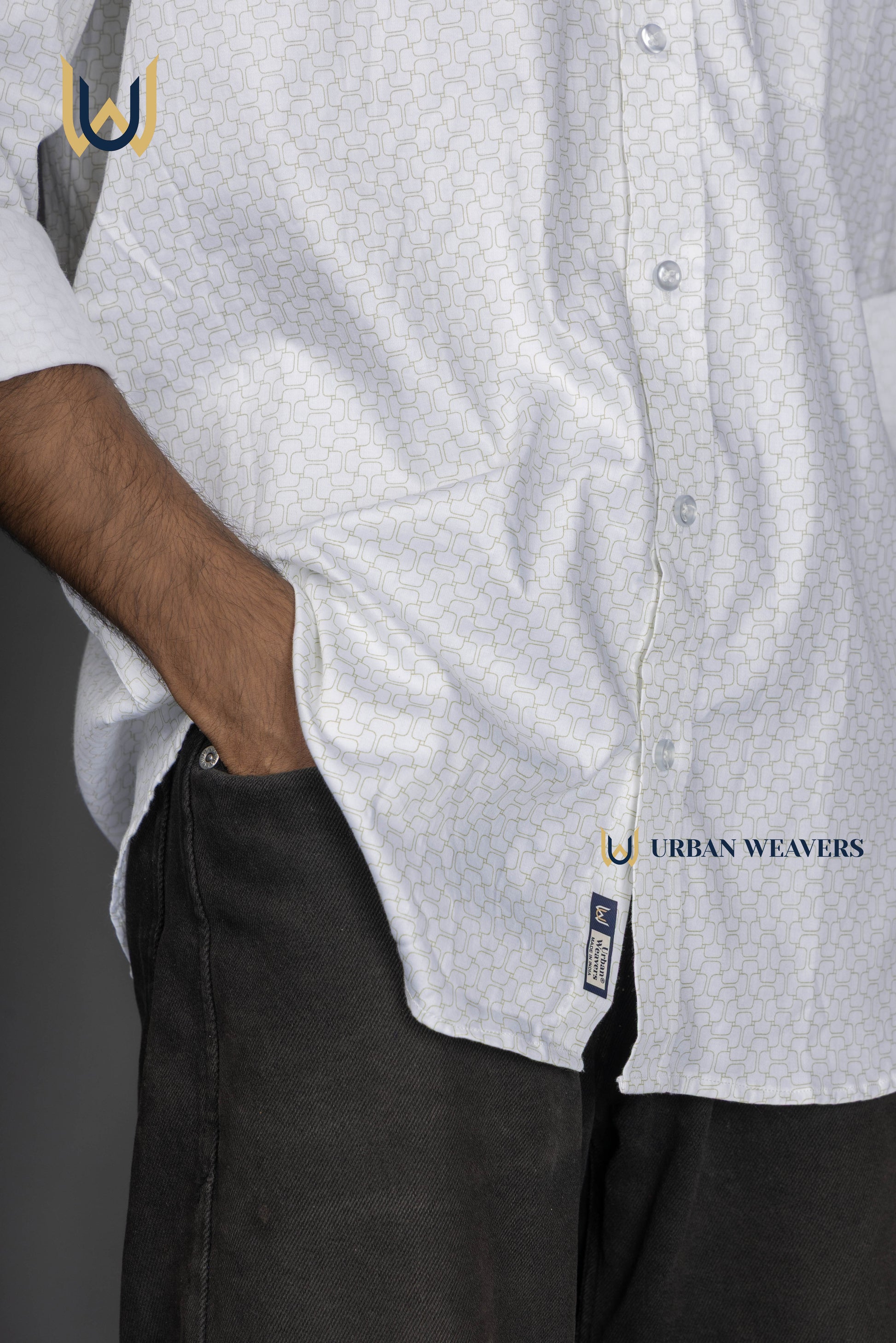 Crisp white with green print accents — this satin shirt adds a soft pop of color while keeping your look clean and balanced.